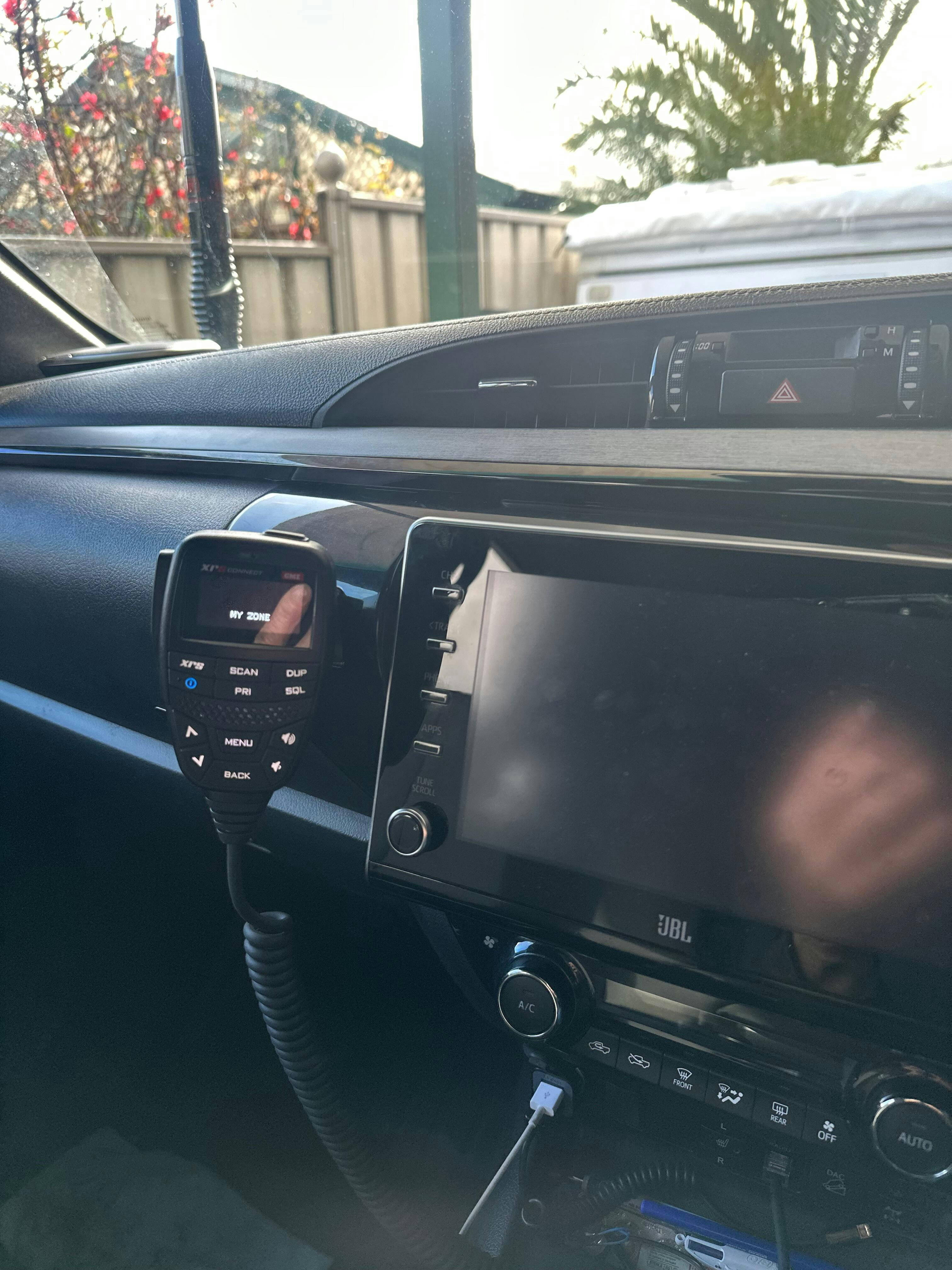 This bracket replaces the passenger seatbelt/airbag warning light to accommodate a UHF Microphone or phone accessories.