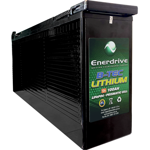 Enerdrive ePOWER B-TEC 100Ah Slim Lithium Battery, 5 Year Warranty. Enerdrive B-Tec 100AH Slim Battery is an ideal solution for those who are limited for space. It can be well positioned behind the back seat of most dual cab utes or narrow spaces in other locations. The limited edition B-Tec 100Ah Slim Lithium has the same DNA boasts as all other Enerdrive B-Tec batteries. With high quality prismatic cells and suitable for up to 1000 Watt inverter with the best aftersales support program in Australia.