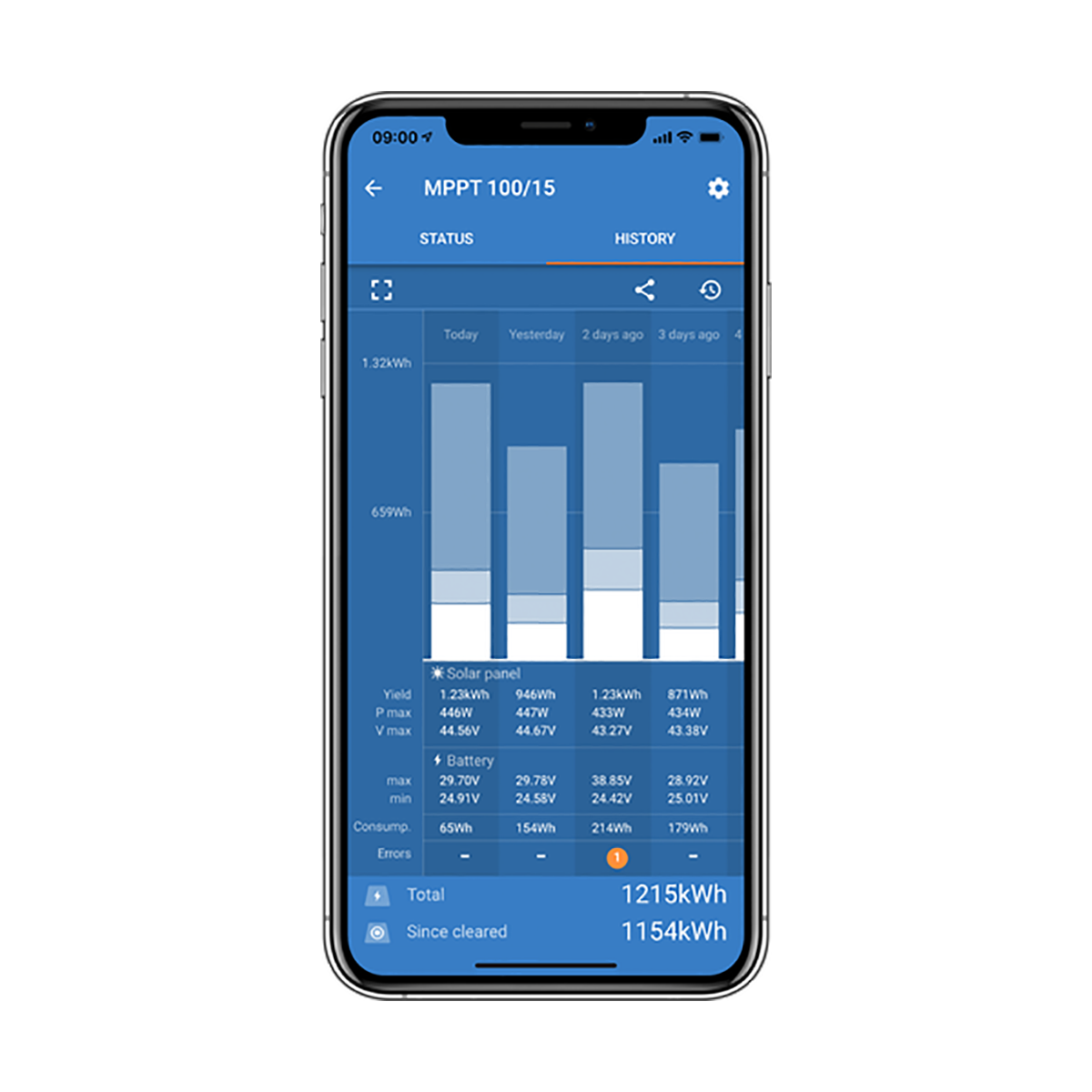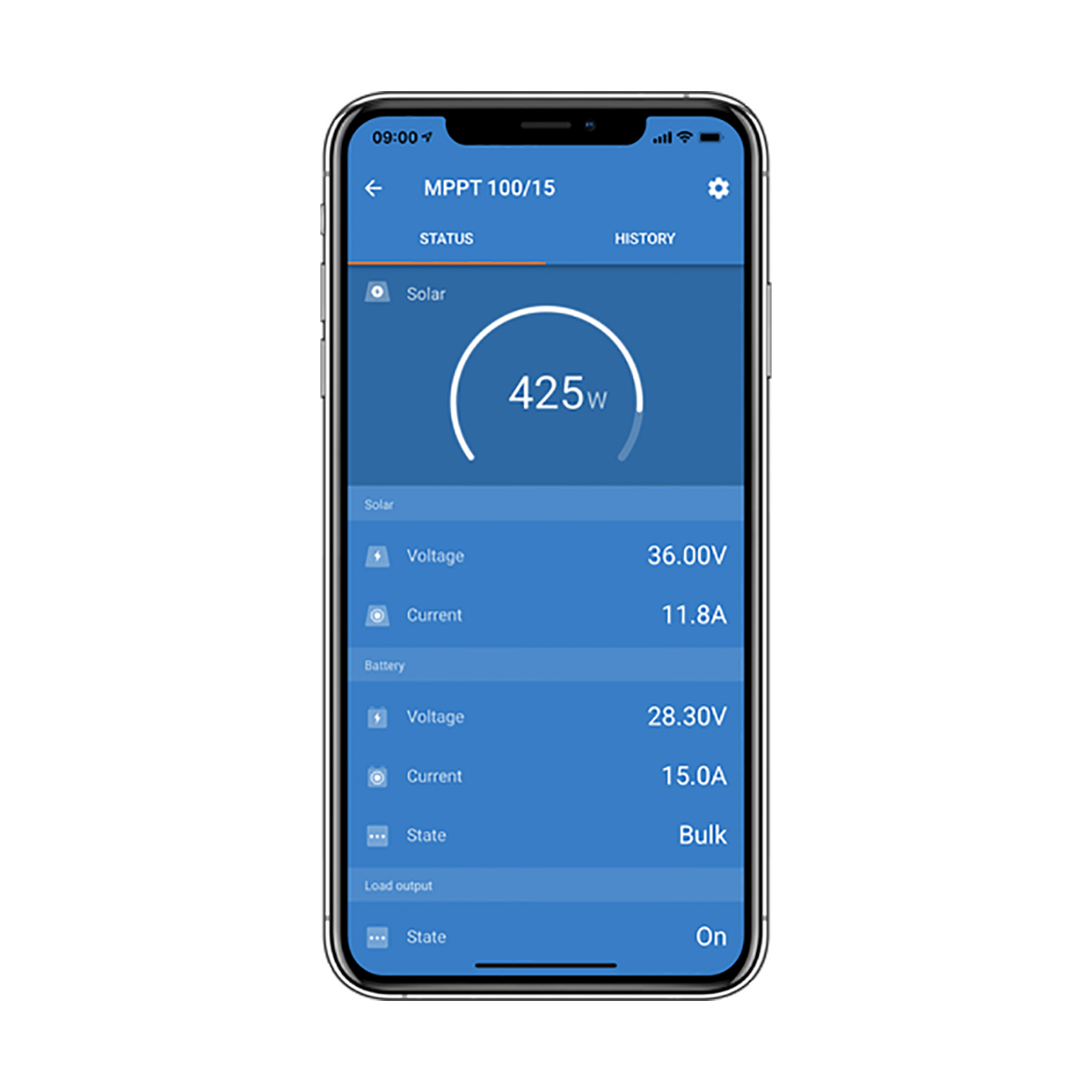A highly efficient and intelligent solar charge controller designed to charge and maintain 12V, 24V or 48V lead-acid or LiFeP04 batteries from 12/24V solar panels. Thanks to its ultra-fast MPPT controller, programmable battery management and innovative tracking algorithms, the charger gets the most out of your solar panels, even during cloudy weather, with charging currents up to 15A. The adaptive 3-stage battery charging includes bulk, absorption and float to charge your battery as quickly as possible and then keep the battery in optimum condition. The charge algorithm can be changed to 8 pre-set algorithms or fully programmed to suit your application. In addition, equalisation or BatteryLife modes can be enabled to maximise the life of your battery. A handy DC load output port automatically disconnects any connected devices at a predetermined voltage to avoid over-discharging and possibly damaging your battery. Configure and monitor the solar charger and view real-time or historical solar and battery data from your Bluetooth® enabled Smartphone, tablet or computer. Safety features include over-current, over-temperature, over-voltage, reverse battery or PV polarity, and output short circuit protection.