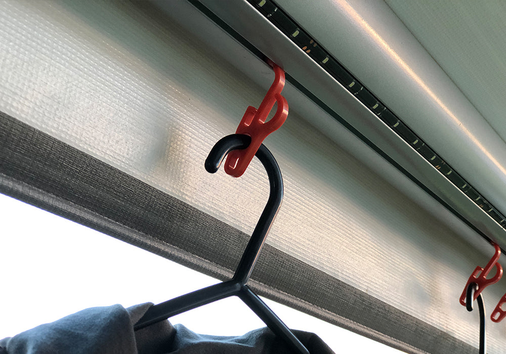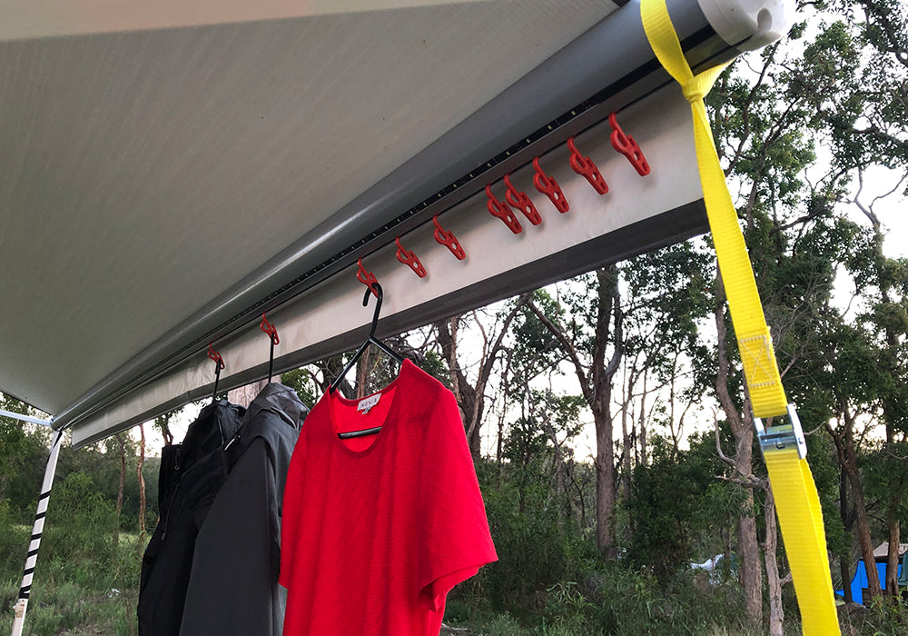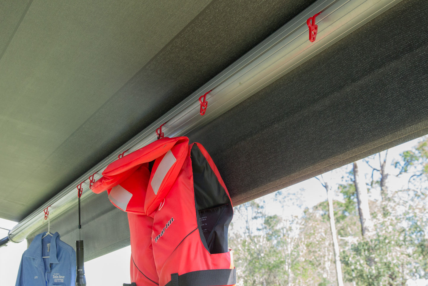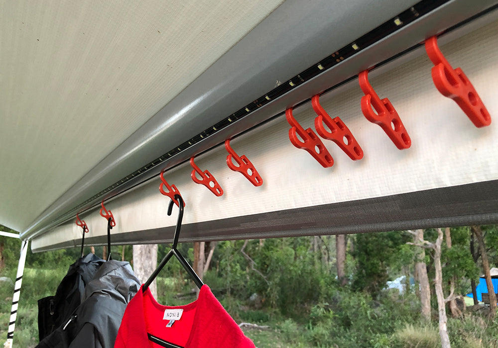 These handy Australian-made hooks slide easily into the sail track of most caravan and motorhome awnings. Our awning hooks provide extra hanging space under your awning, perfect for clotheslines, coat hangers, power cords, and LED Lights.