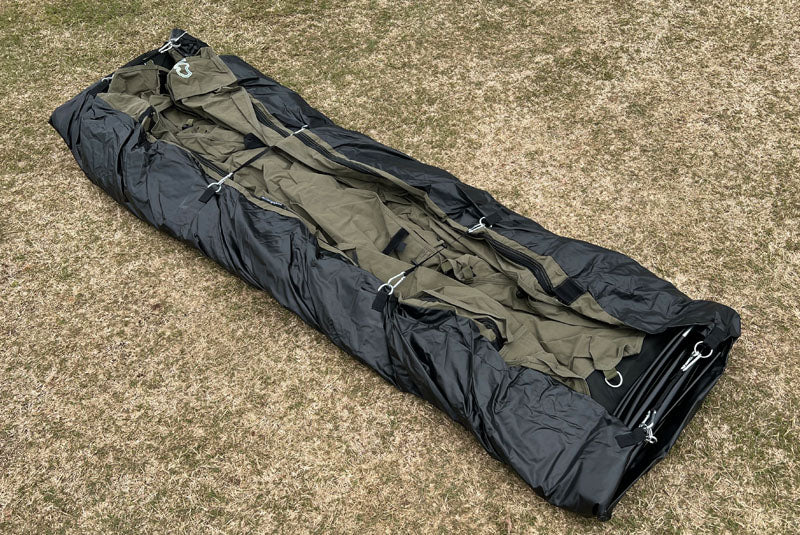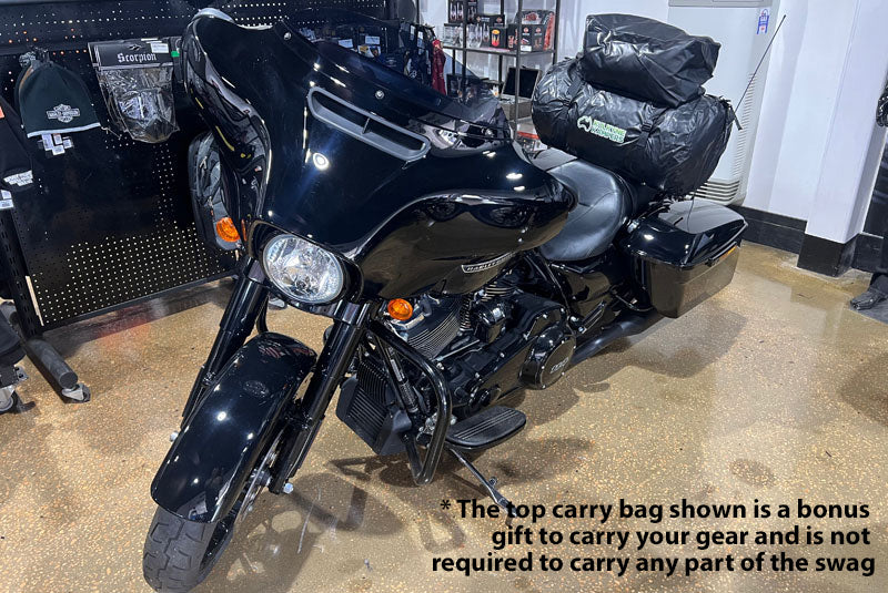 Room has been allowed in the main carry bag to leave up to 1.2 kgs of bedding in the swag when rolled up. This means you can use and carry a light weight sleeping bag or a blanket with your new Biker Swag.