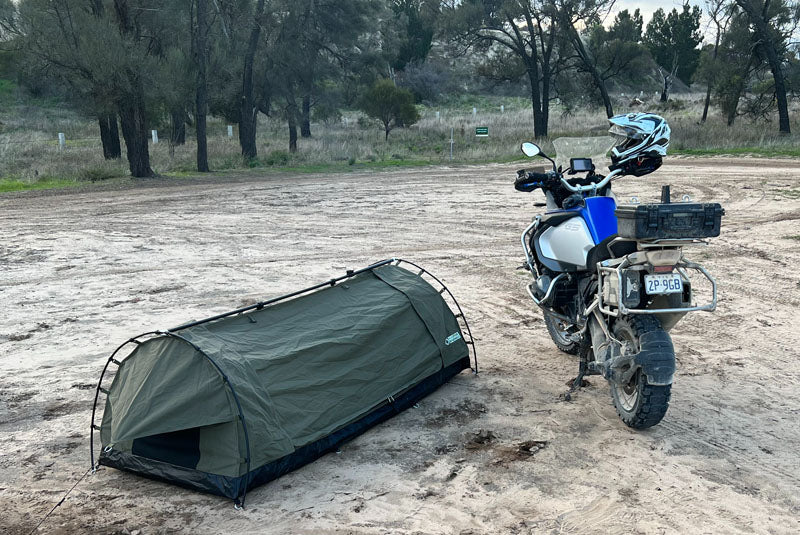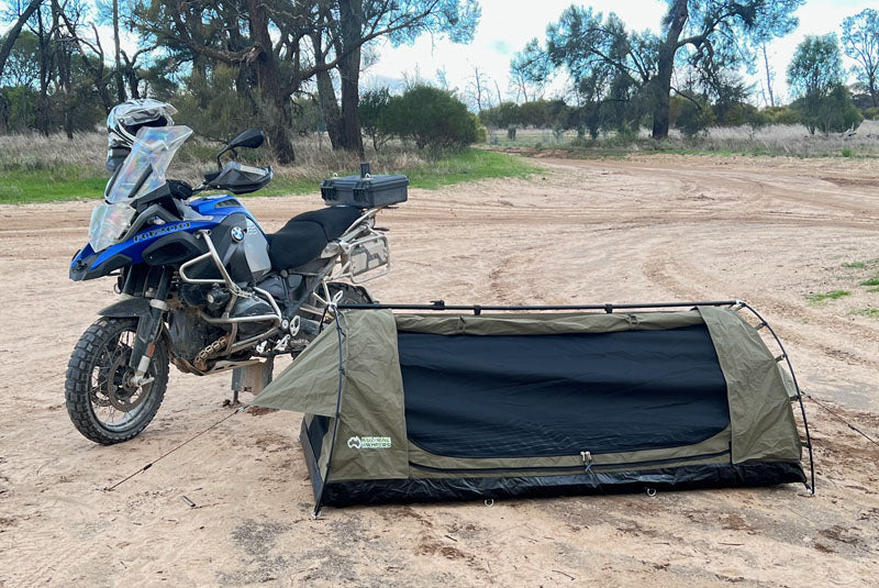 This Biker Swag is supplied with two carry bags. The main cylindrical carry bag is designed to hold the whole swag including poles and sleeping gear up to 1.2 kgs. It has four D-rings at the base so you can secure the carry bag to your motorbike, and four strap points on top so that you can attach the bonus gear carry bag supplied with this swag.