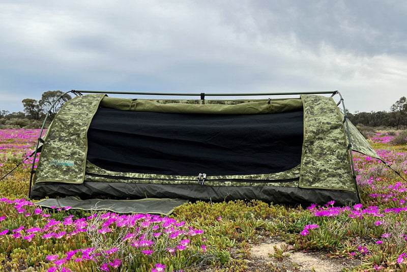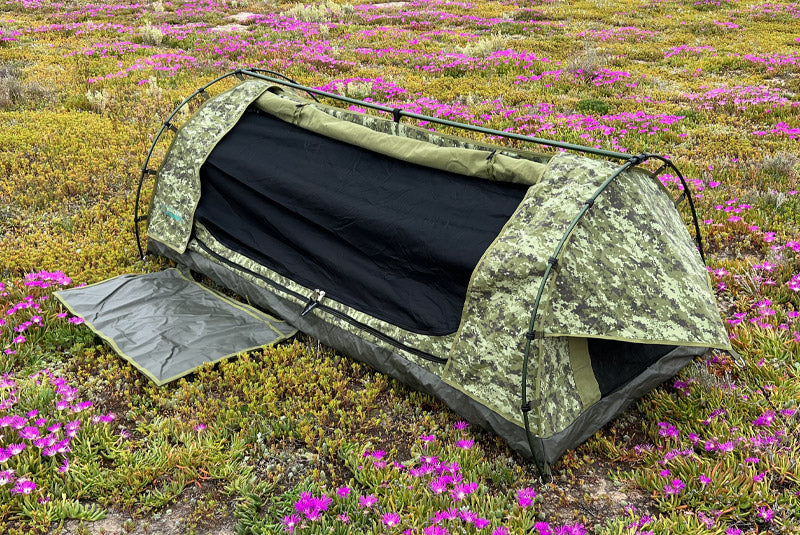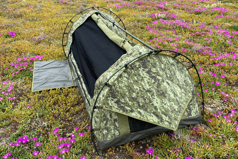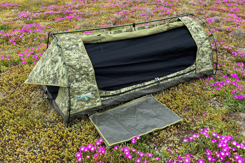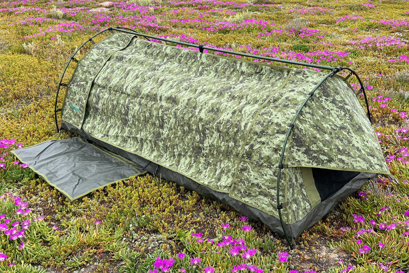 Our new Kulkyne-Digicam king single swag is sure to turn heads with your mates. This great looking swag is made from high quality materials as Kulkyne swags have always been. The king single size swag is ideal for customers up to 6'2" tall and our 70mm foam mattress offers plenty of comfort for guys under 90kgs.