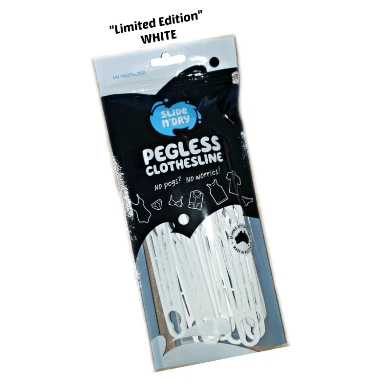 Made from recyclable UV-protected plastic, the Slide n' Dry Pegless Clothesline will not go brittle or fade and is capable of holding wet towels, jeans and all the heavy stuff. The 12 slides simply click together so you can make your line as long or as short as you require.