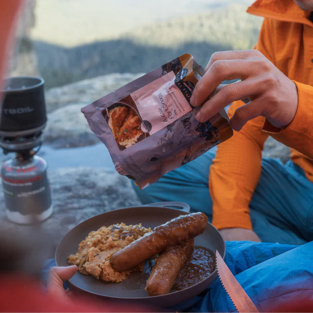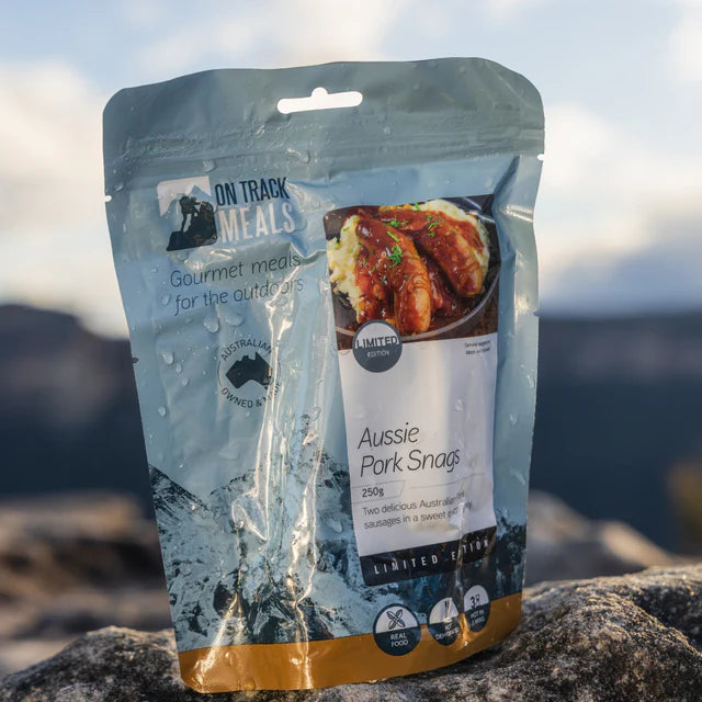 Two tasty Aussie Pork Sausages cooked just right, smothered in a sweet onion gravy that’s packed with flavour. Perfect paired with Pumpkin & Potato Mash or tucked into a piece of bread for a proper feed on your next outdoor adventure.