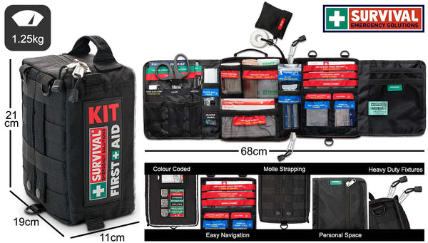 **The new and improved design for the SURVIVAL Vehicle First Aid KIT also features the sophisticated MOLLE system for tailored attachment, new shoulder straps and redesigned zips that are sturdier than ever before, with an extra layer of material on the outside that protects both zips and the KIT’s contents from the elements.**