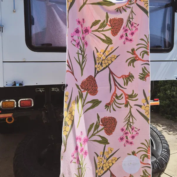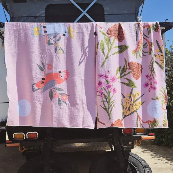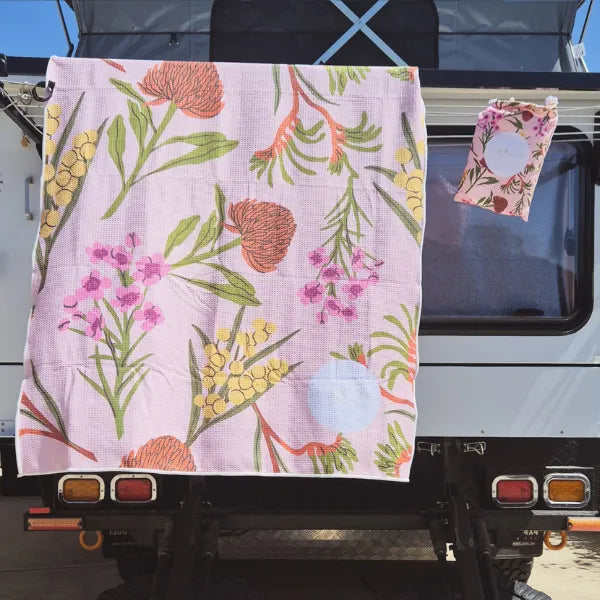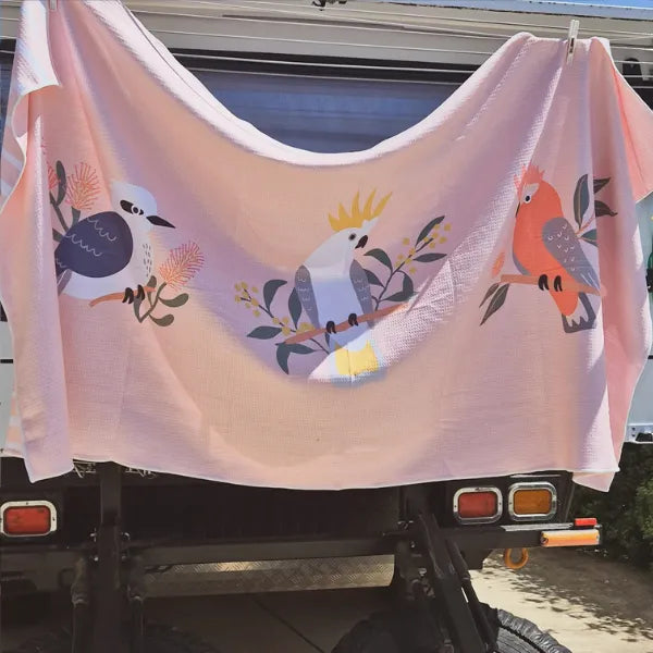 Stay dry and stylish with our lightweight, fast-drying microfiber waffle camping towels, featuring beautifully detailed native Australian bird and flower designs. Ultra-absorbent and soft, these towels come with a matching carry bag and a convenient hanging hook for easy drying. Perfect for camping, beach trips, and all your outdoor adventures. Compact, convenient, and designed to bring a touch of nature wherever you go!