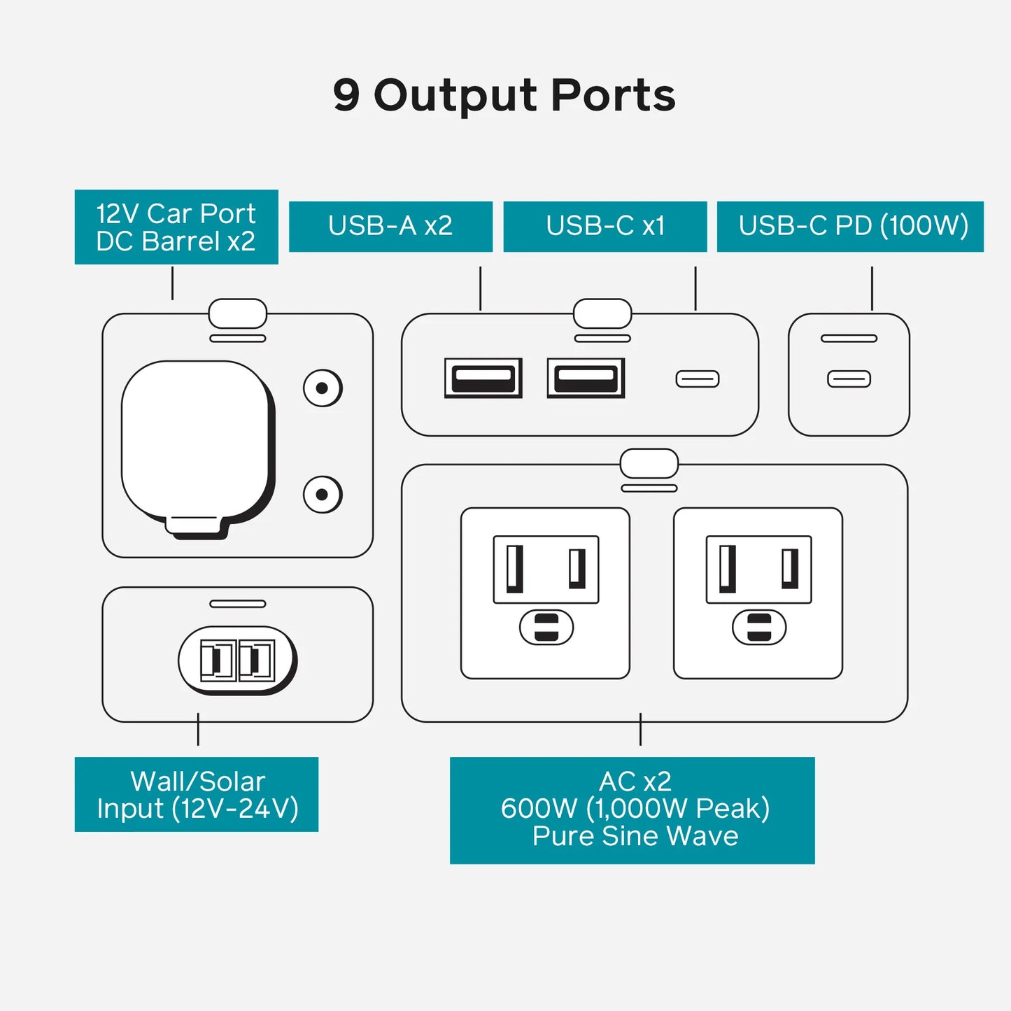 AC Outputs: AC x2; 110V 600W (EU/UK/AUS 230V, 50Hz), 1,000W Surge. Plug types: US, UK, EU, NZ/AUS